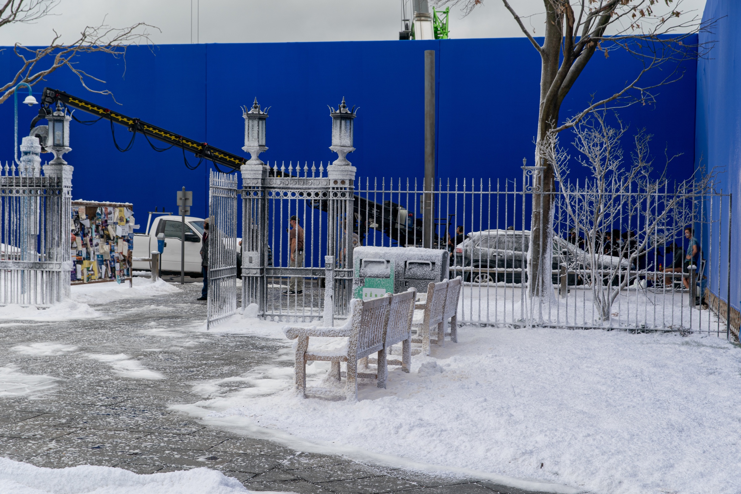 The rest was built in the backlot of Shepperton – like the Beinecke library, and the SOM masterpiece. We built a portion of the plaza in front of it, and a corner of the actual building. We built a portion of the main quad, recreating the walled path, the tree trunks, the metal fence, and a part of the street.