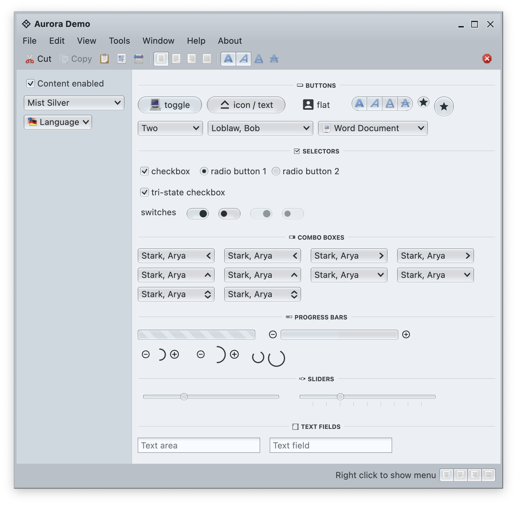 In addition to streamlining the painter APIs, this version adds new surface and outline painters that emulate the appearance of a 3D glass object lit from straight above, as can be seen here under the Mist Silver skin on buttons, combo boxes and other components: