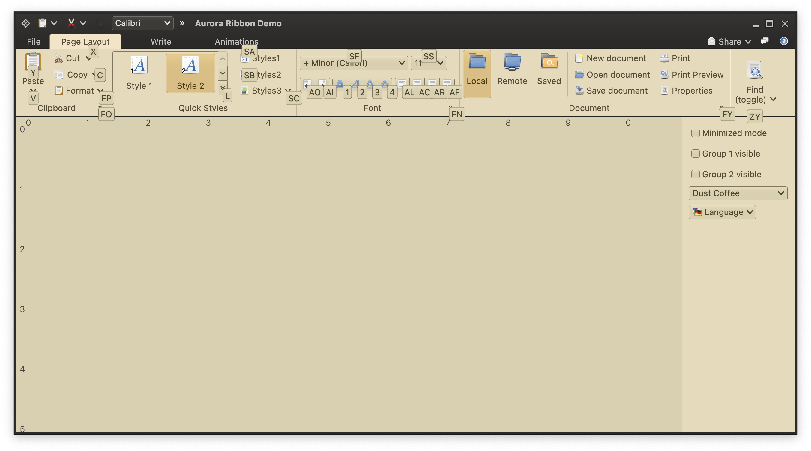 It took a bit of time to get here, but I’m hoping it was worth the wait. The first main addition in this release is the full-featured ribbon container that provides the functionality of the Microsoft Office command bar. It supports regular and contextual ribbon task groups, regular and flow ribbon bands, application menu, taskbar, and anchored command area. It also supports flexible and configurable resizing of the content for ribbon tasks, ribbon bands, and individual ribbon content pieces.