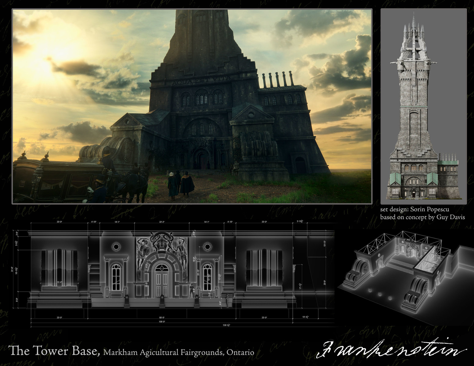 Tamara: We built the base of it with those big scrolling feet, which I called the Sphinx feet, up to about the crown above that beautiful hand-carved door. Then VFX continued to build the tower all the way up. It was a massive build, about 130 by 130 feet at base, and about 30-40 feet high.