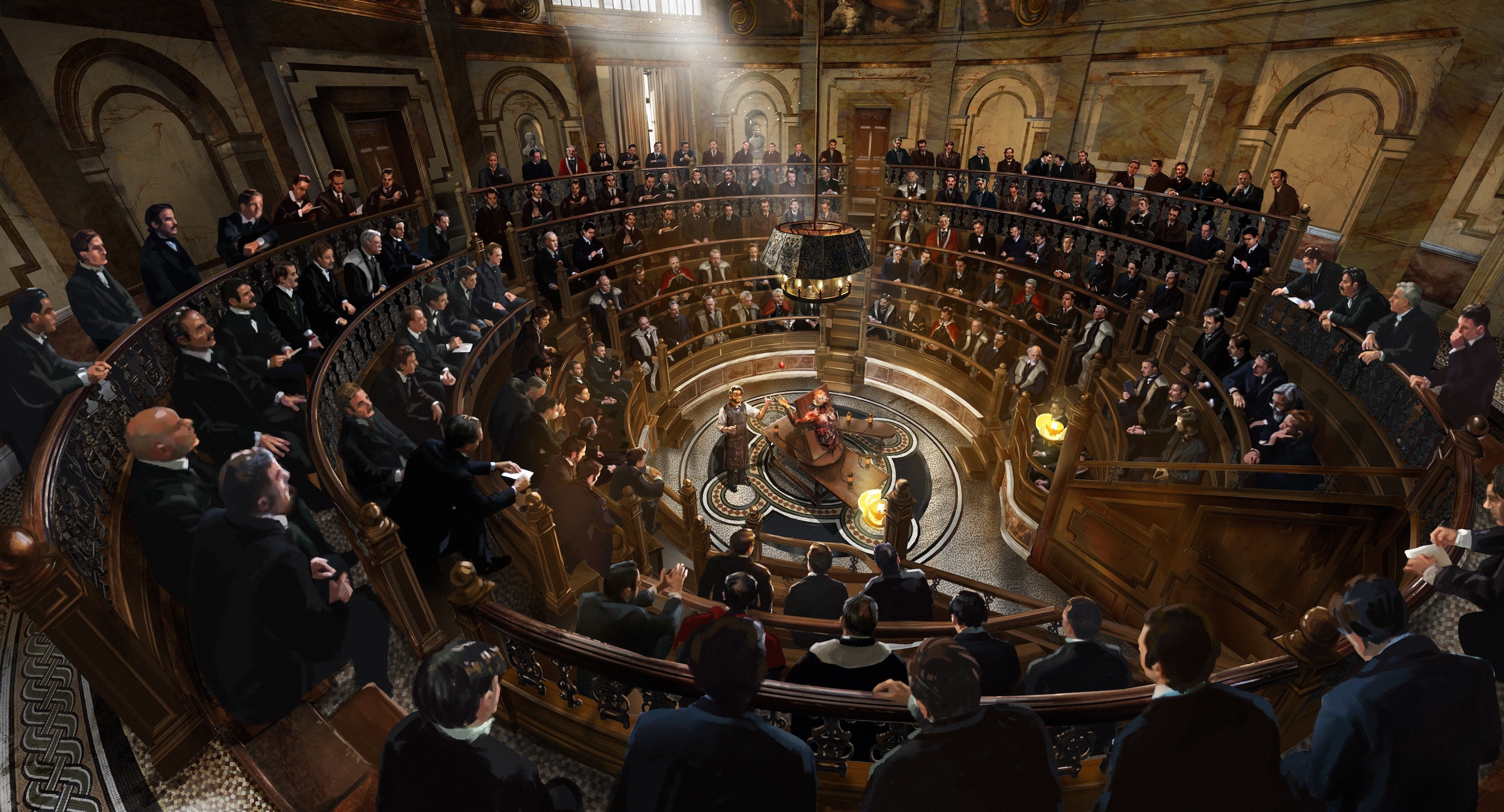 We did have a scene that didn’t make it into the final cut where Victor meets Harlander in the hall, and they start walking through the halls. We were going to shoot that in Glasgow City Hall, which had all the same mosaic tile that you see in the lecture hall, all the same woodwork, the banister, the railing pieces, all those details. All those details are taken from the Glasgow City Hall to match throughout the scene, and then it was cut [laughs]. But the fact that we had some beautiful pieces of inspiration to go from made that a special set.