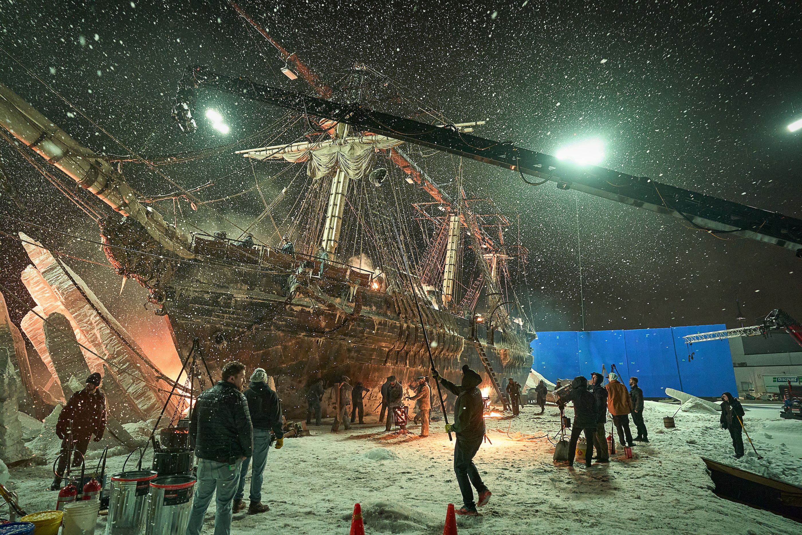 We built the masts to a certain height, and we had a truss system to allow for all the rigging for stunts, for the lighting, for the grips to do blacks, to do green screen, blue screen. Then the VFX carried the masts up to their full extent. We built the entire ice field around the ship in a massive takeover of our studio parking lot. We looked at doing it where we had built the carnival on “Nightmare Alley” which was this parking lot field of an agricultural fair – and that’s where we ended up building our water tower. We looked around at building the ship inside, but there was nothing big enough to allow the space to do the ice field and to get the shots Guillermo wanted. Then we looked outside the city, and eventually it felt like the most convenient place was right in front of the studio. We built it there, and we lost our crew parking, and we had to bus people in as they were parking down the street.