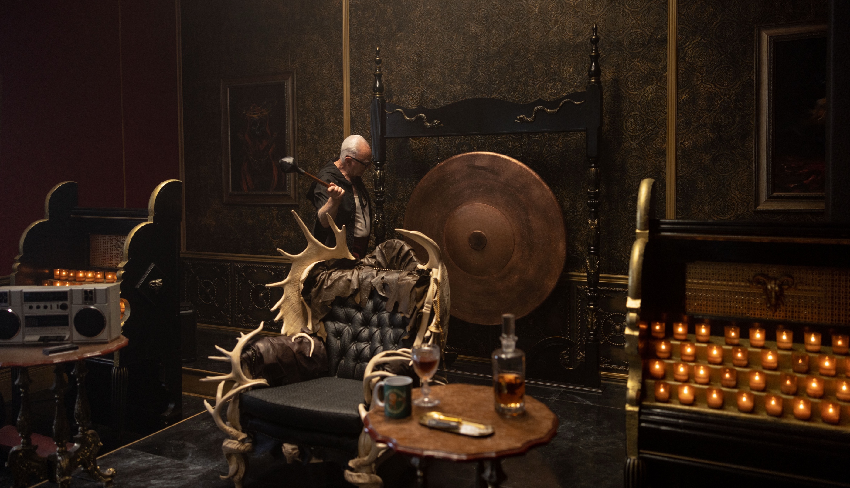 The script described that the fireplace in the great hall had Lucifer with the tridents and everything else. Lucifer is the angel of death. The Bible representation of an angel is dove wings – and we transform that to have bat wings and snake eyes. It’s not a perfect image of what the devil would be, but a representation of the evil in the Bible. When we see the dining room for the first time, we see the devil and the bibles from the snake. The bedroom where PK decides what he is going to do has this landscape of hell on the wall. The uncanny imagery around the great hall is almost flipping the church upside down. The furniture is the transformed church pews. Our chandelier with the spikes is flipping the church chandeliers.