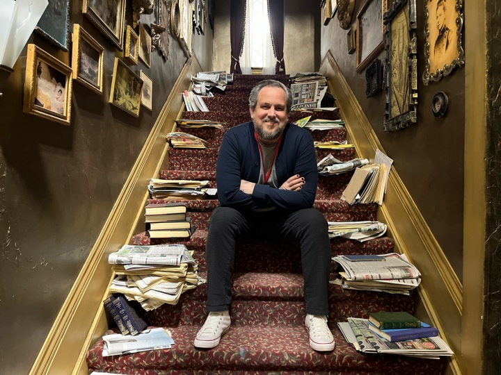 Roger: The script portrays Pendleton as this buffoon. He was rich, and his habits and lifestyle followed his finances. From there we created the story that he used to live in a 25,000 square feet house, and it became a 12,000, and it kept shrinking – but his approach didn’t change. So he doesn’t have enough space for the books and the newspapers anymore, and he puts everything around the staircase. He built the great hall for his parties and his lifestyle.